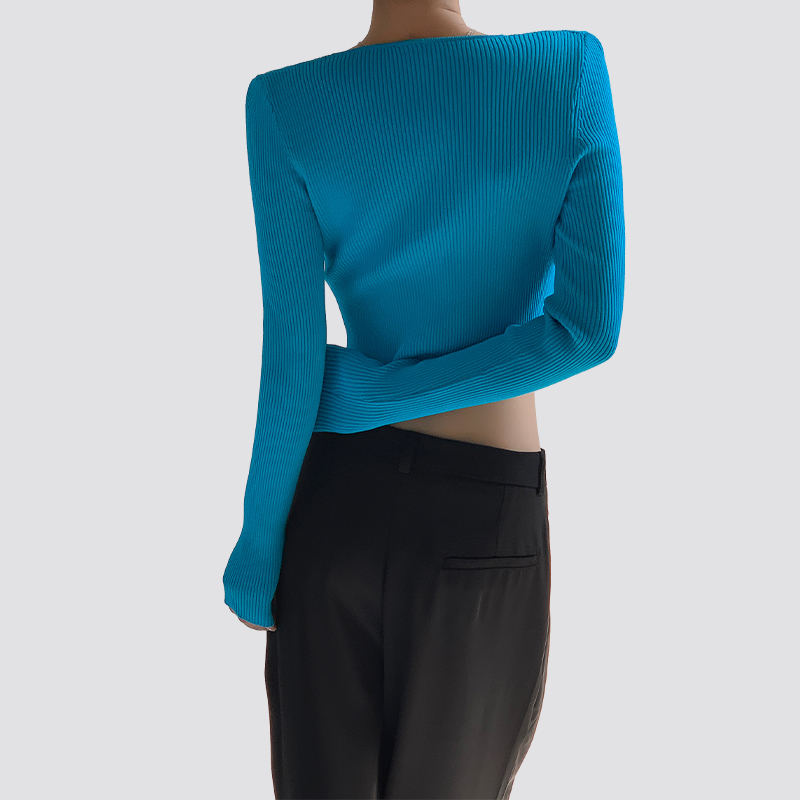 Het bedrijf produceert voornamelijk gebreide truien voor kinderen, heren en dames. Cropped blauwe gebreide top met lange mouwen voor dames company in China.